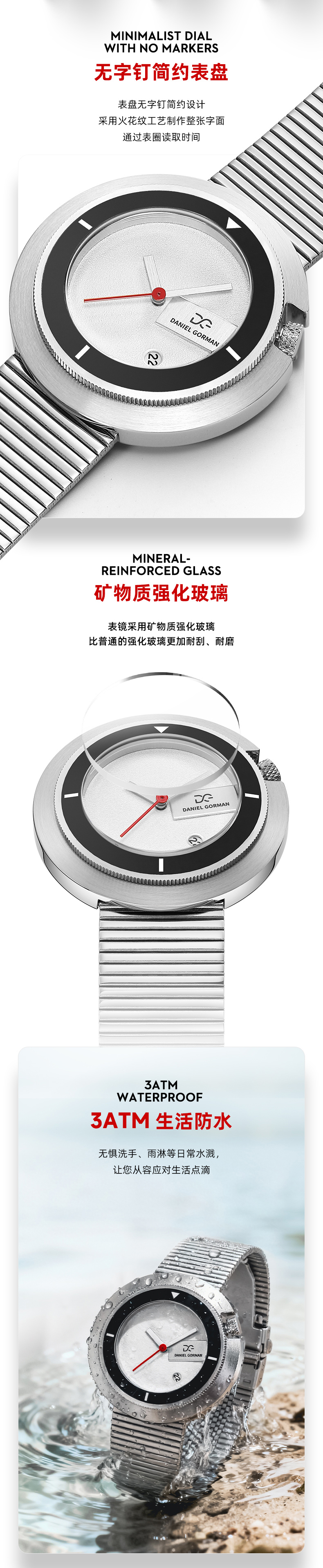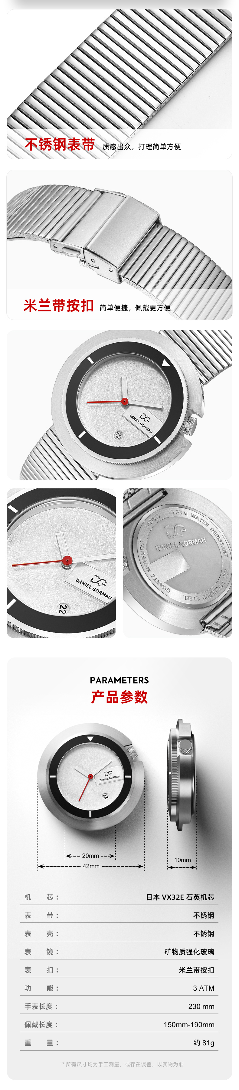 表壳尺寸: 42mm 表带宽度:20mm 表壳厚度:10mm 表壳材质:不锈钢 表带材质:不锈钢 表扣类型:米兰带 手表长度: 230mm 可佩戴周长:150mm-190mm 机芯:日本 VX32E 石英机芯 玻璃: 矿物质强化玻璃 防水: 3ATM 净重:81g