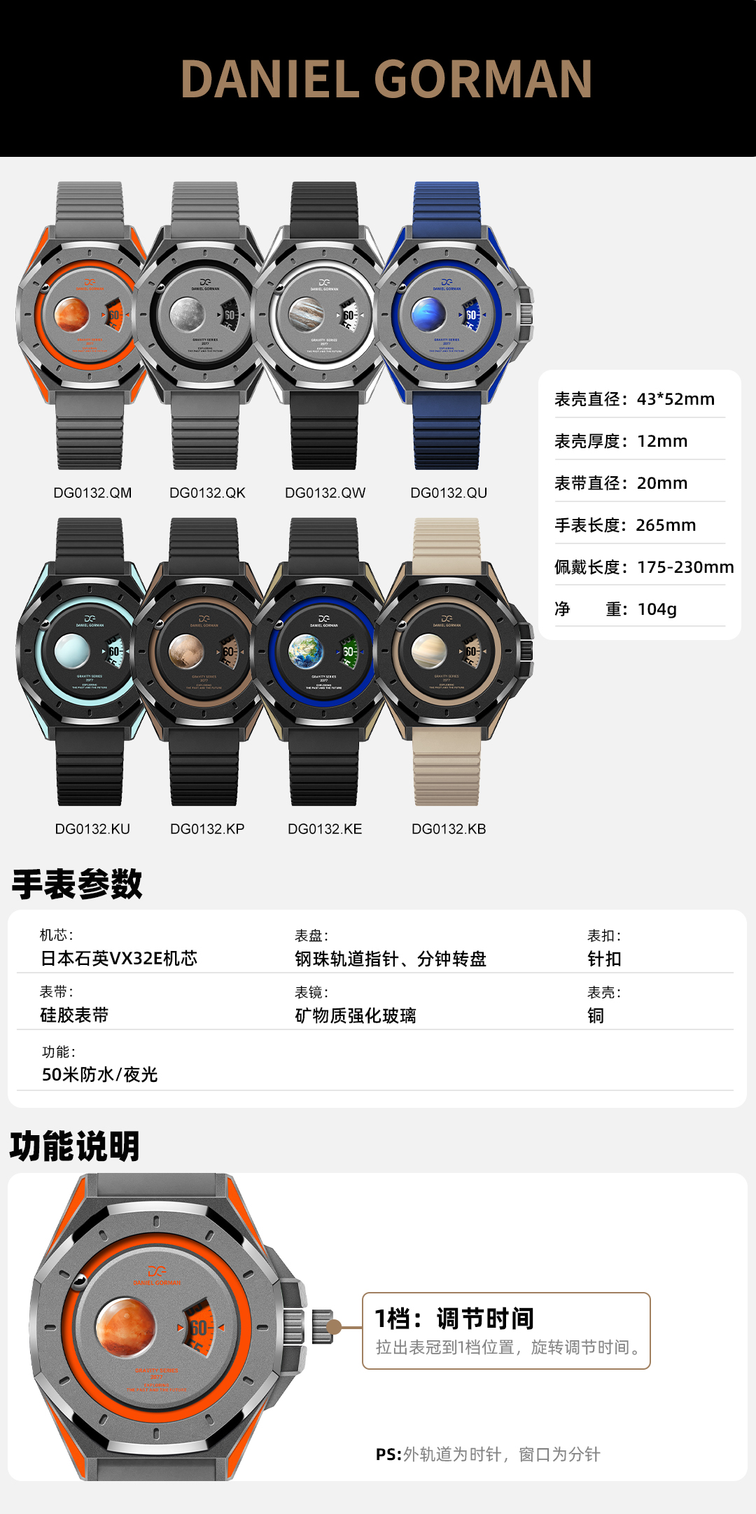 表壳尺寸: 43*52mm 表带直径:20mm 厚度:12mm 表壳材质:铜 手表长度: 265mm 佩戴长度:175mm-230mm 卖点:轨道强夜光 机芯:日本石英VX32E 表带材质:硅胶 防水: 5ATM 净重:104g