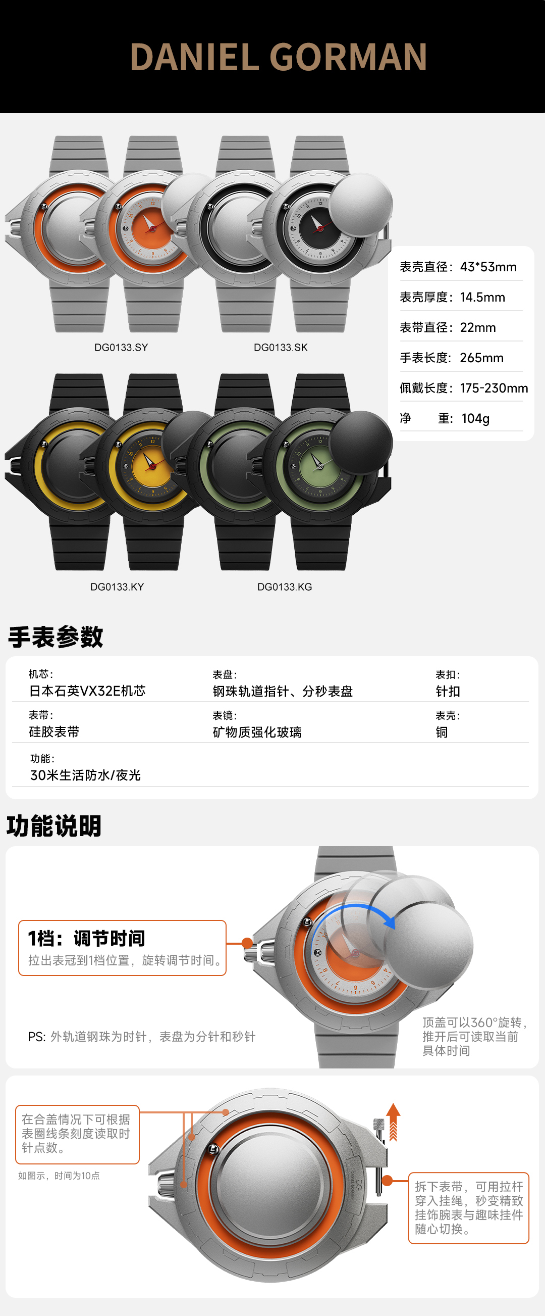 表壳尺寸: 43*52mm 表带直径:22mm 厚度:13.5mm 表壳材质:铜 手表长度: 265mm 佩戴长度:175mm-230mm 卖点:轨道强夜光 机芯:日本石英VX32E 表带材质:硅胶 防水: 5ATM 净重:104g